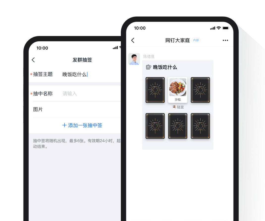 在群聊內發出包含最多六個可抽中項目的抽簽,過程結果對所有群成員實時可見。團建抽個小獎?或者晚飯到底吃什么好?選擇困難癥,交給群抽簽。