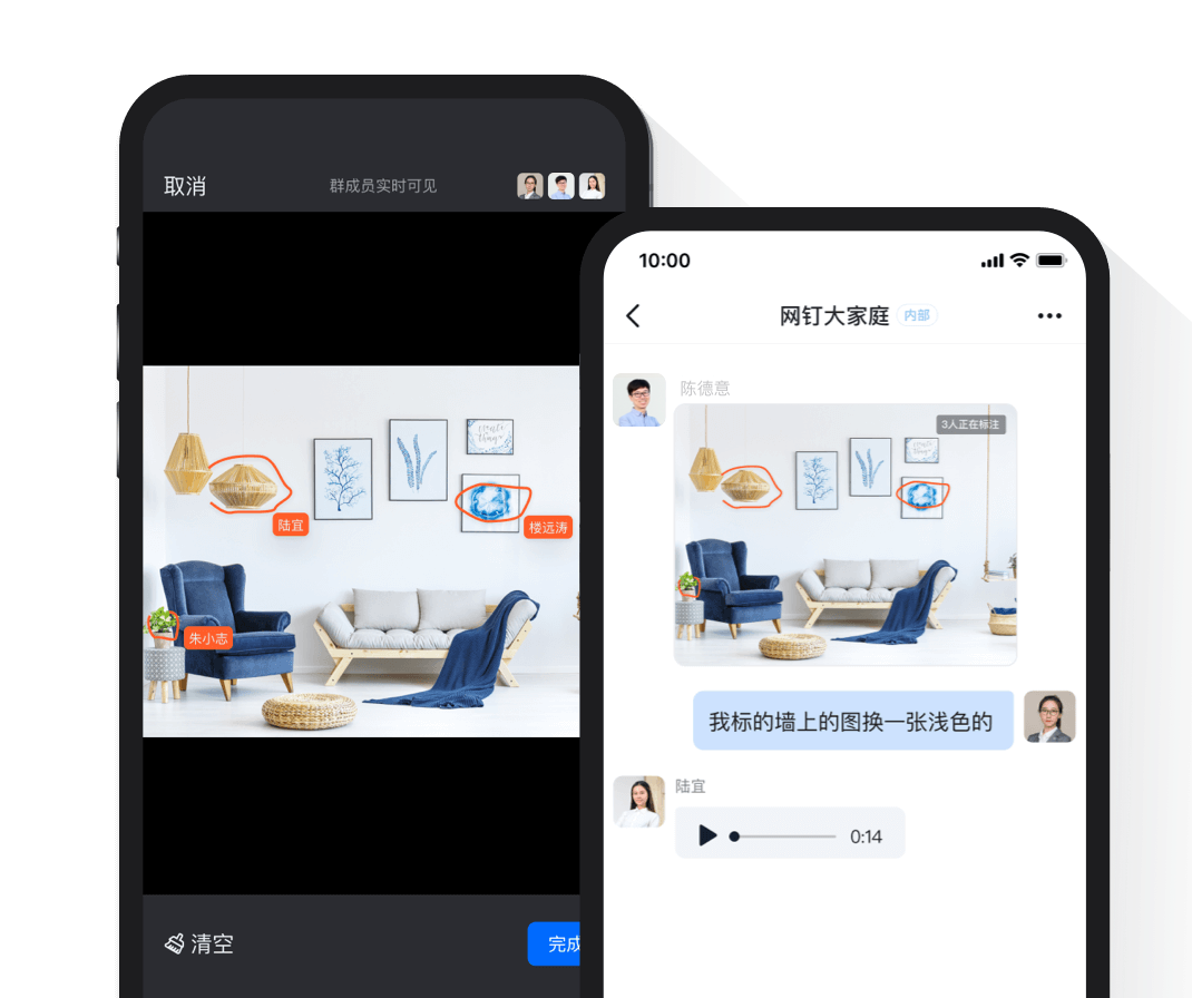 可在同一張圖片中多人實時畫線標注,標注對群成員實時可見。之前需要反復發圖溝通過程,現在只要一起標注即可輕松完成,見圖如見人。