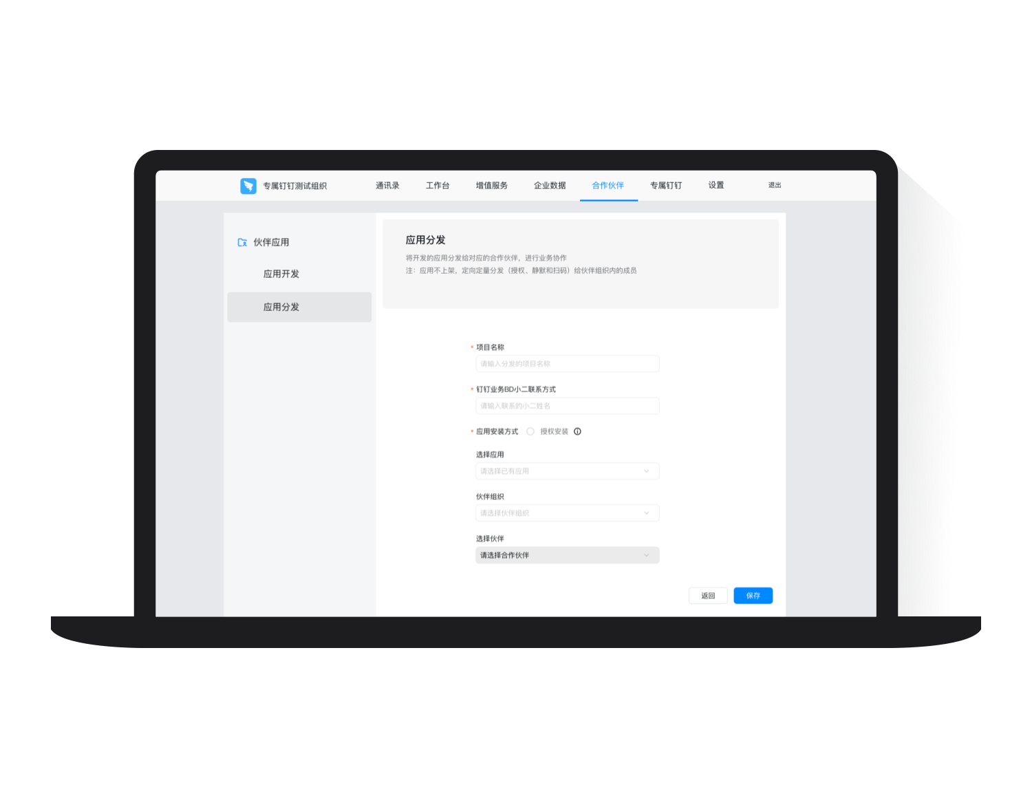支持主企業開發應用快速分發給合作企業, 無需審批,只需操作一步, 就可完成和伙伴的業務協同。